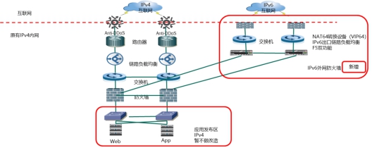 通过新增链路负载均衡等设备,采用协议转换技术(NAT64转换),于2019年底完成公司WWW官网IPv6的网络改造工作,不影响我公司现有互联网业务,形成新的互联网接入区(位于我公司合肥数据中心),结构为: