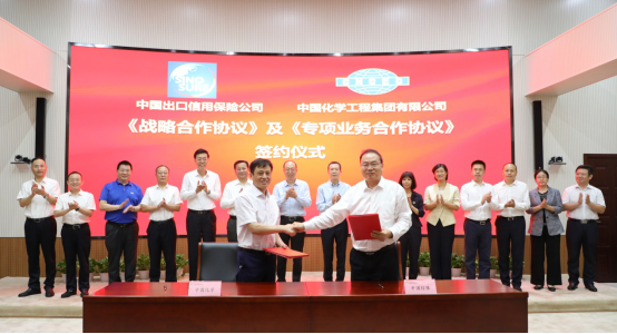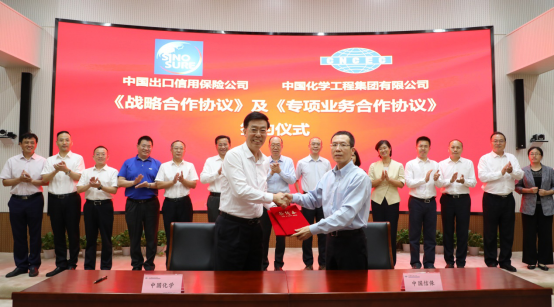 8月3日下午,中国信保宋曙光董事长一行赴中国化学工程集团有限公司(以下简称“中国化学”),与中国化学戴和根董事长会谈,并出席战略合作协议签署仪式。中国信保张辉副总经理和中国化学武宪功副总经理分别代表双方签署战略合作协议。