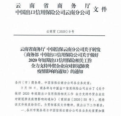 2月26日,云南省商务厅、中国信保云南分公司联合转发了《商务部 中国出口信用保险公司关于做好2020年短期出口信用保险相关工作 全力支持外贸企业应对新冠肺炎疫情影响的通知》(以下简称“通知”),为贯彻落实文件精神,提出了相关工作要求。《通知》要求,一是各州市商务局与中国信保云南分公司各业务处室要加强沟通协作,发挥“州市政府统保平台”作用,加大支持力度,进一步扩大出口信用保险覆盖面,充分利用出口信用保险扶持政策壮大对外贸易经营主体。二是及时深入了解中小微外贸企业面临的资金困难和融资需求,培育中小出口企业保单融资平台,发展“政府+信保+银行”合作机制作用,多渠道帮助企业解决融资难融资贵问题。三是指导企业充分运用“建信通”、“建信融”等我省特色优势保单融资产品,支持对外工程承包和机电产品、成套设备及资本性货物出口,带动外贸发展。四是指导帮助企业利用进口预付款保险,扩大医用物资进口,保障各地疫情防控和复工复产需要。