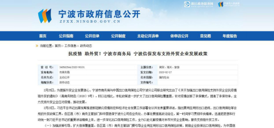 2月25日,宁波市商务局与中国信保宁波分公司联合研究出台了《关于加强出口信用保险支持外贸企业抗疫情稳外贸的通知》(以下简称“通知”)。较以往相比,本轮政策进一步扩大了出口信用保险覆盖面,针对疫情创新了承保模式,提高了承保效率,全力支持外贸企业应对疫情、推动发展。《通知》要求,各区县(市)商务主管部门和中国信保宁波分公司各业务处、办事处要提高政治站位,第一时间学习贯彻中央精神,迅速把思想和行动统一到习近平总书记的重要讲话精神上来,进一步深化出口信用保险工作,全力以赴化解疫情对宁波市外贸企业影响,服务支持稳外贸工作。