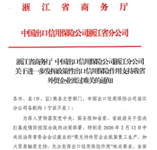 2月25日,浙江省商务厅与中国信保浙江分公司联合下发了《关于进一步发挥政策性出口信用保险作用 支持我省外贸企业渡过难关的通知》(以下简称《通知》),要求积极发挥政策性出口信用保险的作用,应对疫情影响,促进外贸稳增长。