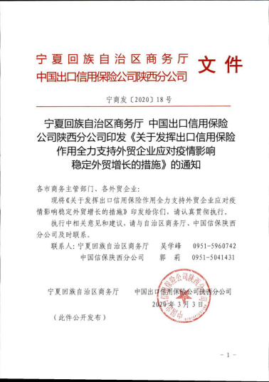 3月3日,中国信保陕西分公司联合宁夏商务厅印发《关于发挥出口信用保险作用全力支持外贸企业应对疫情影响稳定外贸增长的通知》(以下简称“通知”),全力支持宁夏外贸企业用好出口信用保险,增强抗风险能力,稳住外贸基本盘。