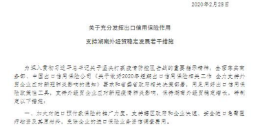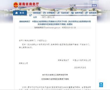 2020年2月27日,湖南省商务厅、中国信保湖南分公司联合印发《充分发挥出口信用保险作用 支持湖南外经贸稳定发展若干措施》,提出要深入贯彻习近平总书记关于坚决打赢疫情防控阻击战的重要指示精神,认真落实党中央、国务院和省委省政府相关决策部署,用足用好出口信用保险政策性工具,支持外经贸企业应对新冠疫情肺炎影响,保持湖南外经贸稳定增长。