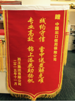 为保障企业正常经营,中国信保依据保险合同就企业的损失进行了足额的赔偿,赔款金额高达1000多万美元。从企业通知风险发生到获得赔款仅用了不到2个月的时间。西王国际贸易有限公司总经理马本强说:“这个案子我们有两个没想到:一是没想到市场风险这么大,我们做国际贸易这么多年,真的没想到这么大金额的即期信用证,开证行能够违反国际惯例擅自违约;二是没想到这么大的案件中国信保能够在这么快的时间内支付赔款。说句实在话,这个案子之所以能有今天这么圆满的结果,是中国信保的专业给我们企业创造的价值。”西王集团副总经理王红雨更是感概万分:“此次企业面临巨额损失,中国信保雪中送炭,不愧是为外贸企业排忧解难的好帮手。”