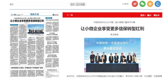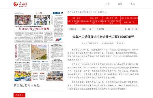 近日,中国信保举行第二届小微客户服务节开幕式。《人民日报(海外版)》、新华社、中央电视台、《光明日报》、《经济日报》、《国际商报》、《金融时报》、《中国银行保险报》、《中国财经报》、新华网等800多家新闻媒体进行了报道和转载,多角度展示了中国信保加快数字化转型,有针对性地推出多项普惠金融政策措施,做深做实小微企业服务的举措和成绩。4月28日,中央电视台财经频道《第一时间》以《金融政策加码,支持外贸型小微企业》为题,报道了中国信保加快推动客户服务数字化变革,构建小微数字化服务体系的成绩。5月1日,在全国人民欢度五一国际劳动节之日,《人民日报(海外版)》要闻版以《去年出口信保促进小微企业出口超1500亿美元》为题,以详实的数据肯定了公司对“稳就业”、“稳外贸”、“保市场主体”发挥的重要作用。