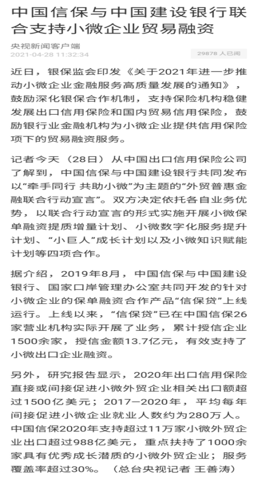 央视新闻客户端:中国信保与中国建设银行联合支持小微企业贸易融资