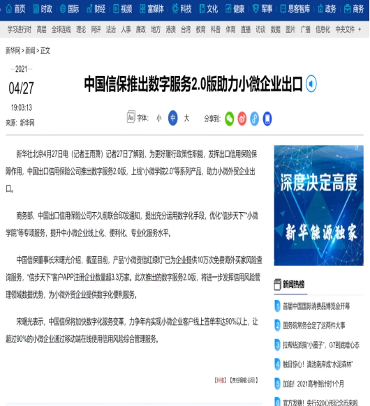 新华社:中国信保推出数字服务2.0版助力小微企业出口