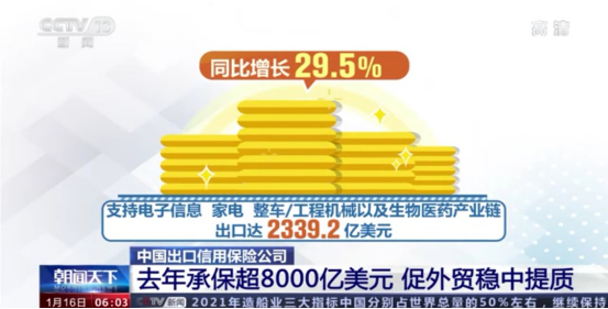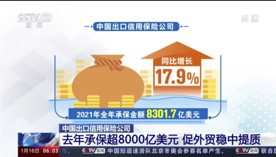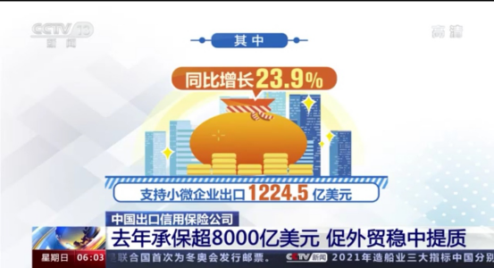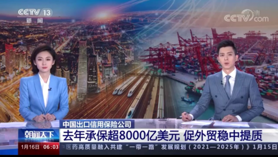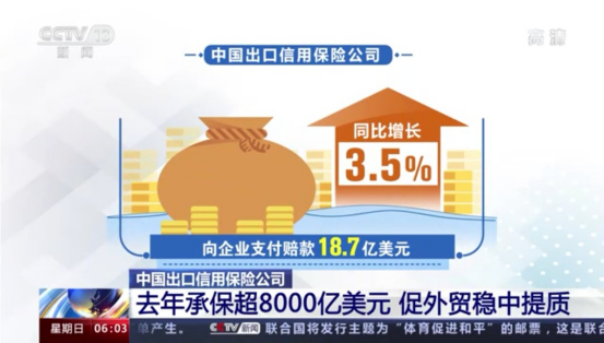 央视新闻频道:中国出口信用保险公司去年承保超8000亿美元 促外贸稳中提质