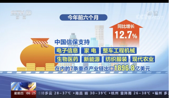 在保障产业链供应链稳定畅通方面,今年前六个月,中国信保支持电子信息、家电、整车工程机械、生物医药、新能源、纺织服装以及现代农业在内的7条重点产业链出口1896.8亿美元,同比增长12.7%。