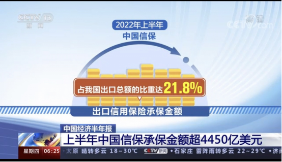 7月28日,在中国信保召开2022年度半年工作会议期间,中央广播电视总台CCTV13新闻频道《朝闻天下》栏目以《上半年中国信保承保金额超4450亿美元》为题,以翔实的数据肯定了中国信保上半年坚持稳字当头、稳中求进,完整、准确、全面贯彻新发展理念,在保出口、服务共建“一带一路”和风险防控中充分发挥政策性作用,为稳外贸、稳经济大盘作出的积极贡献,时长1分21秒。以下是详细报道和截图: