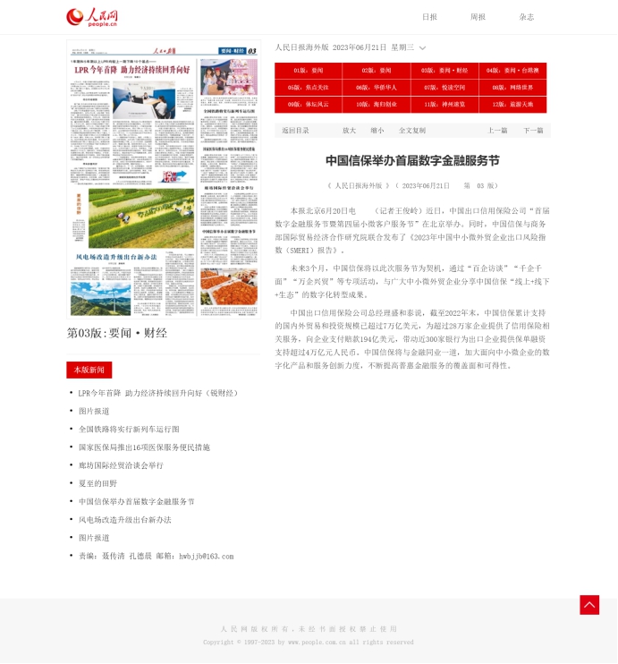 近日,中国信保举行首届数字金融服务节暨第四届小微客户服务节开幕式。《人民日报》、《人民日报(海外版)》、新华社、中央广播电视总台、《光明日报》、《经济日报》、《国际商报》、《金融时报》、《中国银行保险报》、新华网、中国网等媒体报道和转载1152篇。多角度展示了中国信保作为政策性金融机构,近年来不断加大普惠金融资源投入,深入实践“数字+普惠”的服务理念,通过“百企访谈”“千企千面”“万企兴贸”等专项活动,与广大中小微外贸企业分享中国信保“线上+线下+生态”的数字化转型成果的举措和成绩。新闻媒体的集中报道彰显了中国信保心怀“国之大者”、坚持“金融惠民”,坚定不移走中国特色金融发展之路的使命担当。截至发稿时报道仍在持续中。以下部分报道内容和截图: