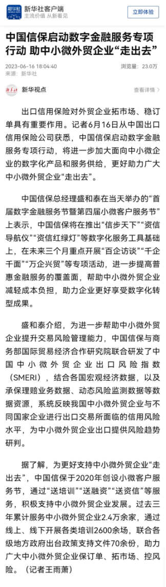 新华社:中国信保启动数字金融服务专项行动 助中小微外贸企业“走出去”
