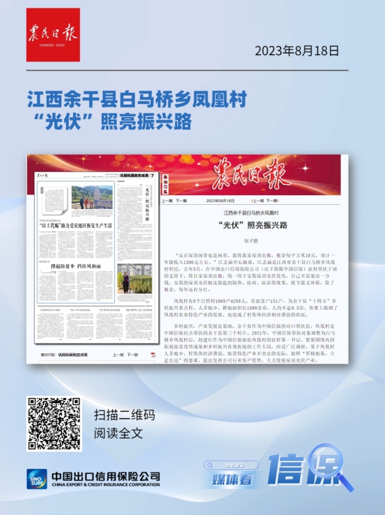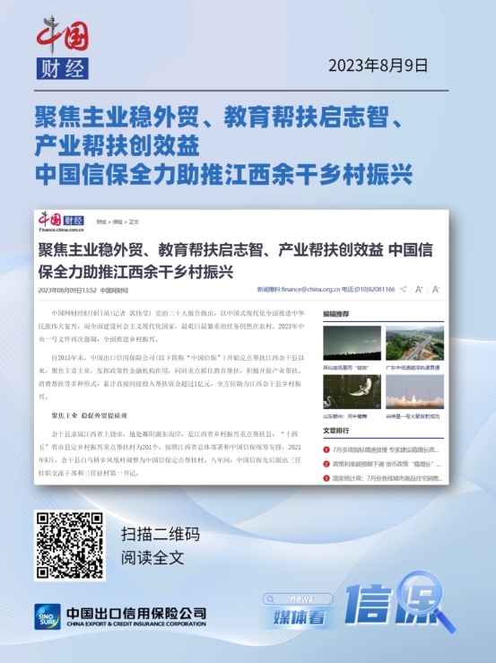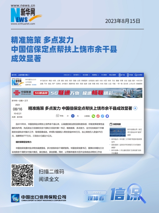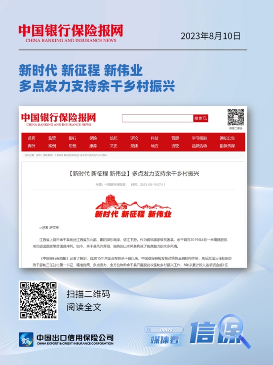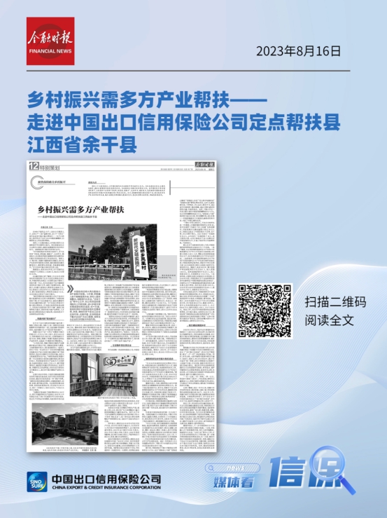 近日,新华网、中国网、《农民日报》、《金融时报》、《中国银行保险报》等中央主流媒体、全国性行业媒体组成报道团,赴中国信保定点帮扶的江西省余干县进行采访报道,深入中国信保帮扶最基层的县、村和学校等地,实地采访帮扶干部、驻村书记、支教干部、当地帮扶群众以及中国信保承保的产业帮扶企业。报道团大篇幅报道了中国信保助力乡村振兴的举措和成效,积极宣传了中国信保在江西余干扎实开展定点帮扶工作的成果,肯定了中国信保认真贯彻习近平总书记关于乡村振兴的重要指示精神,发挥出口信用保险支持作用,协调统筹全公司力量,助力乡村振兴取得的成绩,展示了中国信保负责任央企形象。