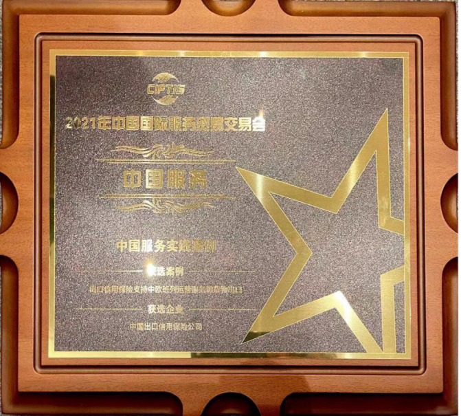 9月4日,在服贸会服务示范案例评选活动中,中国信保报送的《出口信用保险支持中欧班列运营服务和货物出口》在全国1000多个案例中脱颖而出,荣获“2021年中国国际服务贸易交易会中国服务示范案例”奖项,中国信保成为惟一一家入选案例遴选并获此殊荣的政策性金融机构。