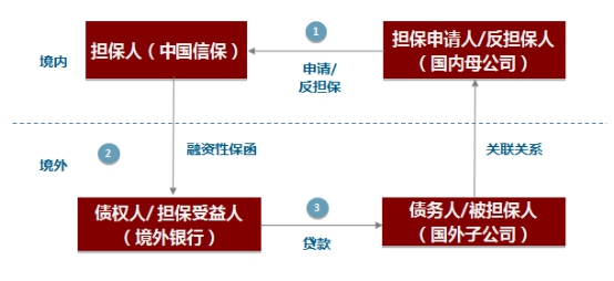中国信保以跨境担保的方式,向境外融资银行(或其他债权人)出具见索即付保函,承担特定境外借款人的还款风险,一般由该境外借款人的国内最高信用级别的母公司向中国信保提供全额反担保,或提供中国信保接受的其他形式的反担保。
